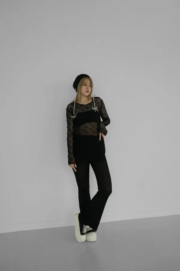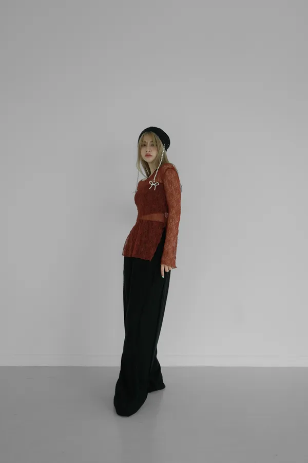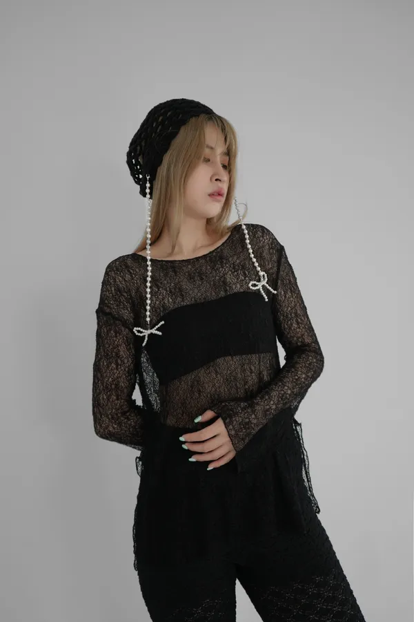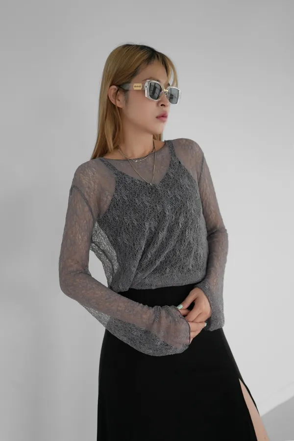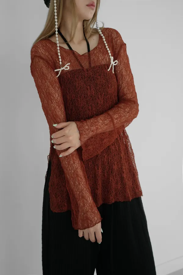 斜肩下開岔蕾絲上衣