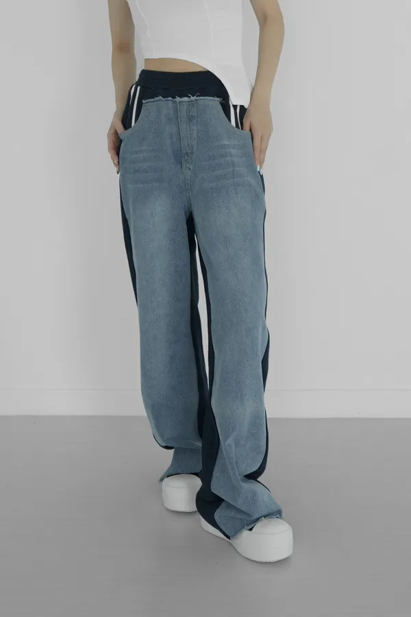 牛仔接棉長褲
