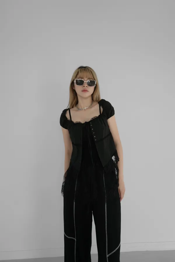 排扣接蕾絲一字上衣