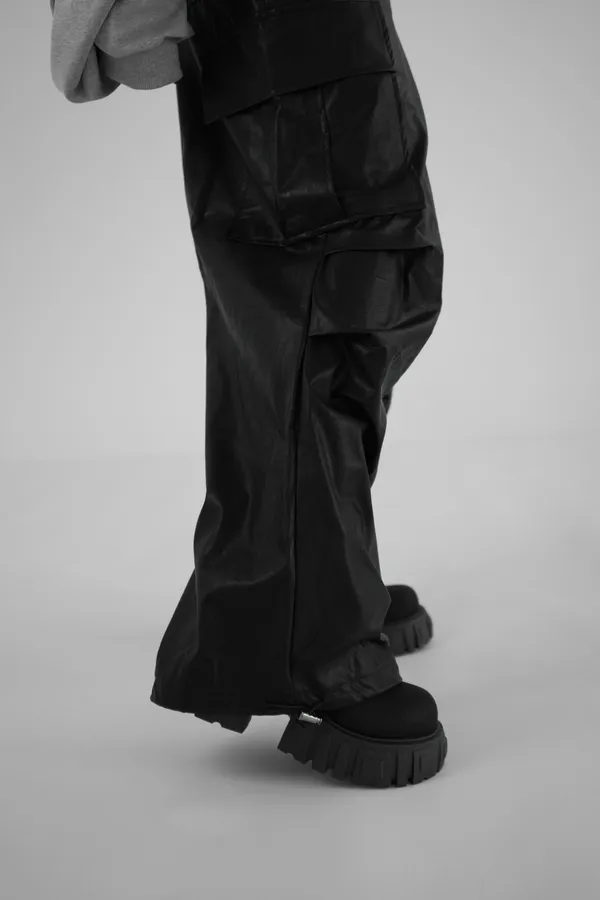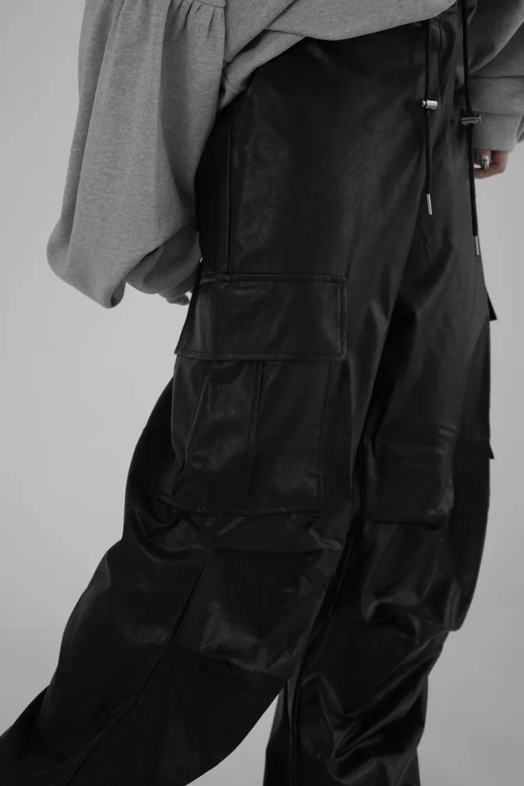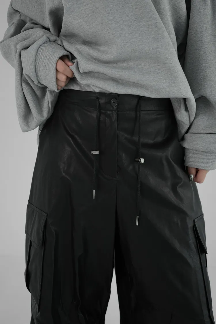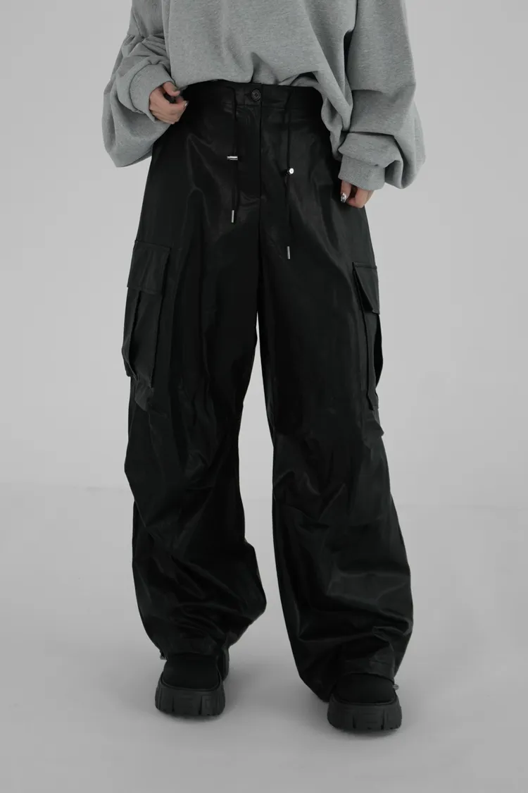 皮革寬長褲